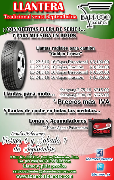 En Barroso SA. tambien te ofrecemos llantas para tu automovil en las mejores marcas y de la mejor calidad porque sabemos que para ti lo mas importante es brindarle seguridad a tu familia.